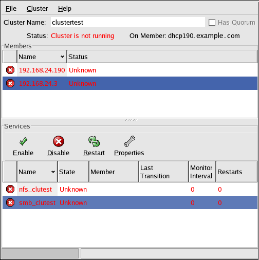 To start the cluster software on a member, run the Cluster Status Tool and choose Cluster => Start Local Cluster Daemons. The cluster member's Status field changes from Disabled to Active.