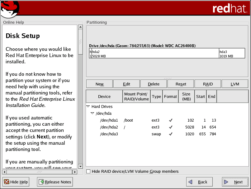 RAID: Used to provide redundancy to any or all disk partitions. It should only be used if you have experience using RAID. To read more about RAID, refer to the Red Hat Enterprise Linux System Administration Guide.