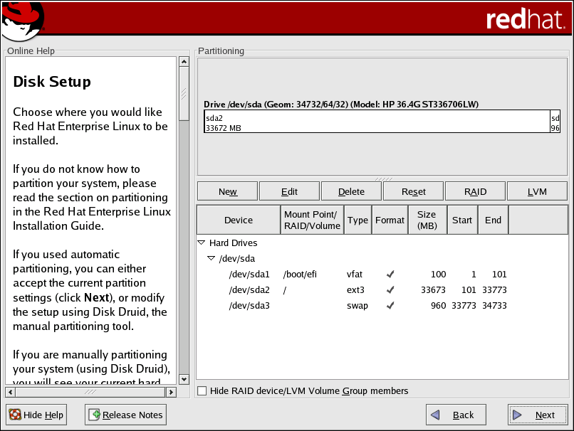 If you chose automatic partitioning and selected Review, you can either accept the current partition settings (click Next), or modify the setup using Disk Druid, the manual partitioning tool.