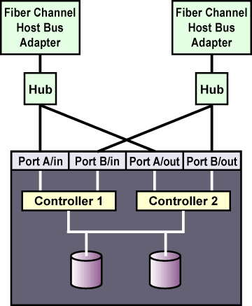 To connect multiple cluster nodes to the same host port on the RAID array, use a Fibre Channel hub or switch. In this case, each host bus adapter is connected to the hub or switch, and the hub or switch is connected to a host port on the RAID controller.