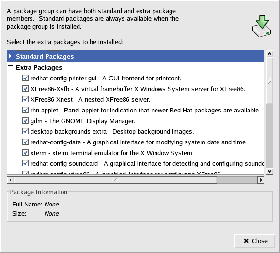 The interface for this application is similar to the one used for individual package selection during installation. Packages are divided into package groups, which contain a list of standard packages and extra packages that share common functionality. For example, the Graphical Internet group contains a Web browser, email client, and other graphical programs used to connected to the Internet. The standard packages can not be selected for removal unless the entire package group is removed. The extra packages are optional packages that can be selected for installation or removal, as long as the package group is selected.