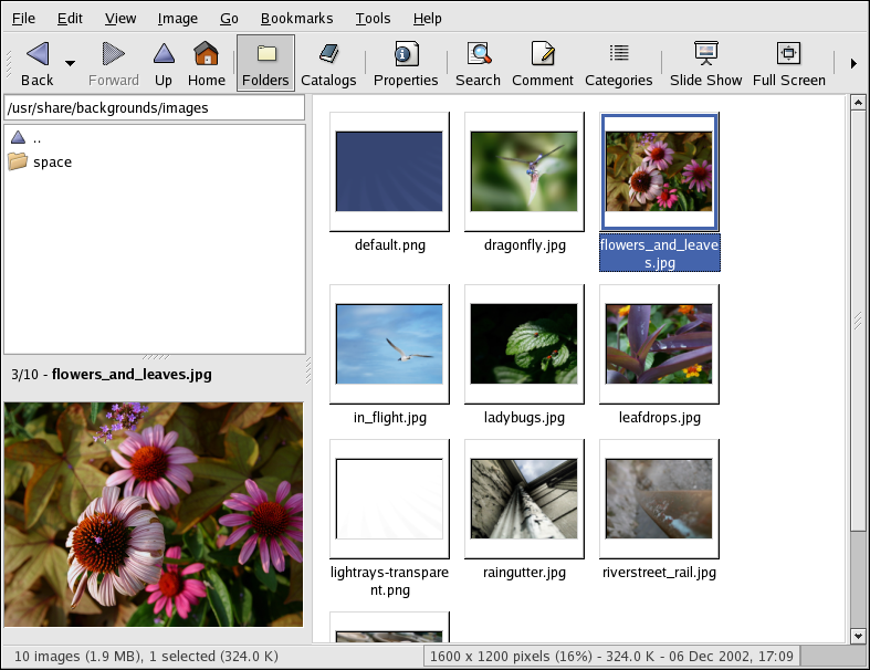 gThumb is useful for viewing individual image files as well as browsing collections of files in folders. It supports zoom in and zoom out functions, as well as thumbnails of all image files within a directory. It also supports several advanced options not found in Nautilus.